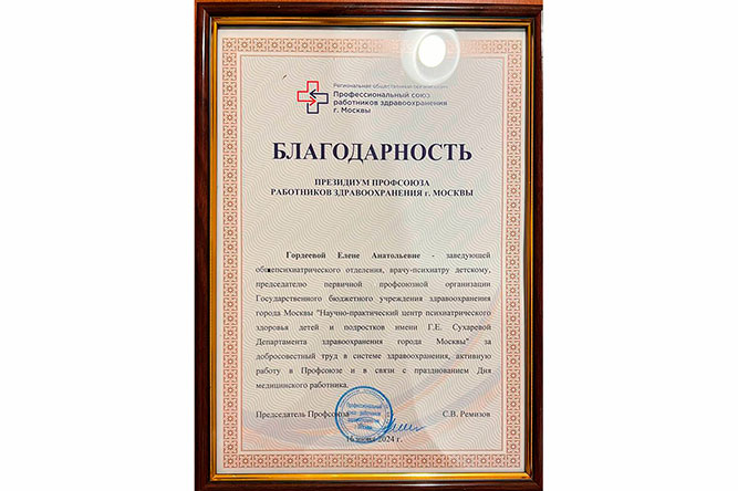 Благодарность от Профсоюза работников здравоохранения г. Москвы
