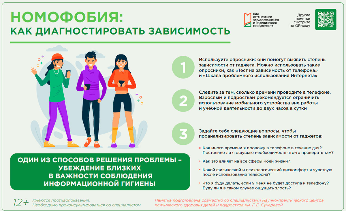Чтобы не допустить развитие номофобии, постарайтесь находить альтернативные виды деятельности в течение дня, используйте мобильные приложения, в которых можно установить лимит времени на использование телефона. Постарайтесь в целом ограничить время использования устройства: не пользуйтесь устройством за час до сна, сразу после пробуждения и во время еды, не берите его в магазин или на прогулку.https://niioz.ru/moskovskaya-meditsina/gazeta-moskovskaya-meditsina-cito/