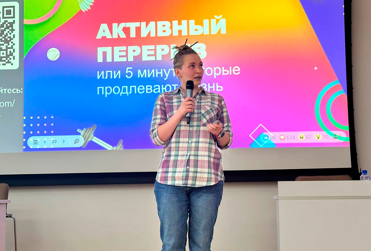 Также о своей работе в молодежном совете рассказала Татьяна Берестенькова, врач по ЛФК ГБУЗ «Московский городской центр реабилитации больных со спинномозговой травмой и последствиями детского церебрального паралича ДЗМ». Она представила проект «АКТИВНЫЙ ПЕРЕРЫВ или 5 минут, которые продлевают жизнь».