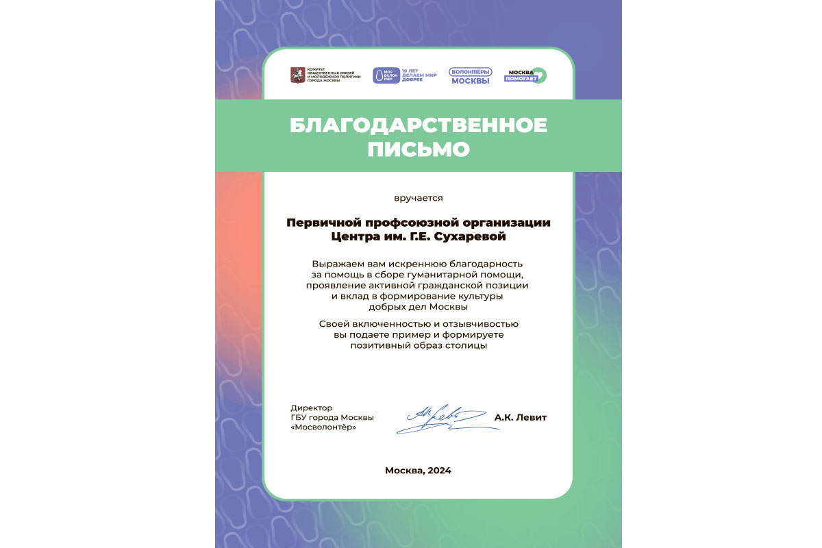 Профсоюзный комитет выражает искреннюю благодарность Петру Васильевичу Безменову, директору Центра, за поддержку инициативы и предоставление транспорта; Светлане Бондаренко, кастелянше отделения №2 за неоценимую помощь в сборе гумпомощи; коллегам из АХЧ за погрузку и доставку.