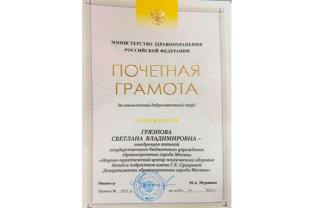 7 ноября в торжественной атмосфере состоялось вручение Светлане Владимировне Грязновой, заведующей аптекой Центра им. Г. Е. Сухаревой, почетной грамоты от Министерства здравоохранения РФ за многолетний добросовестный труд.